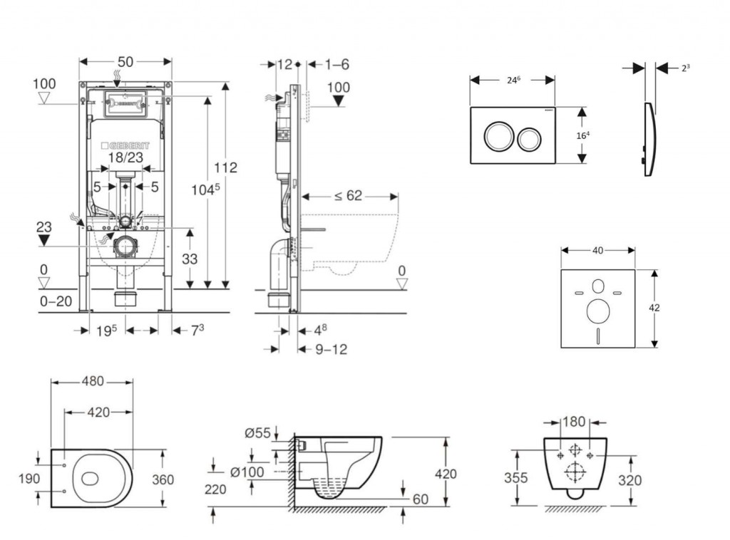 - rám pro nástěnné WC s připojovacími rozměry dle EN 33 a přesahem do 62 cm