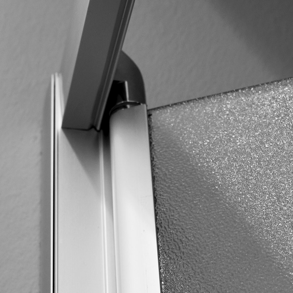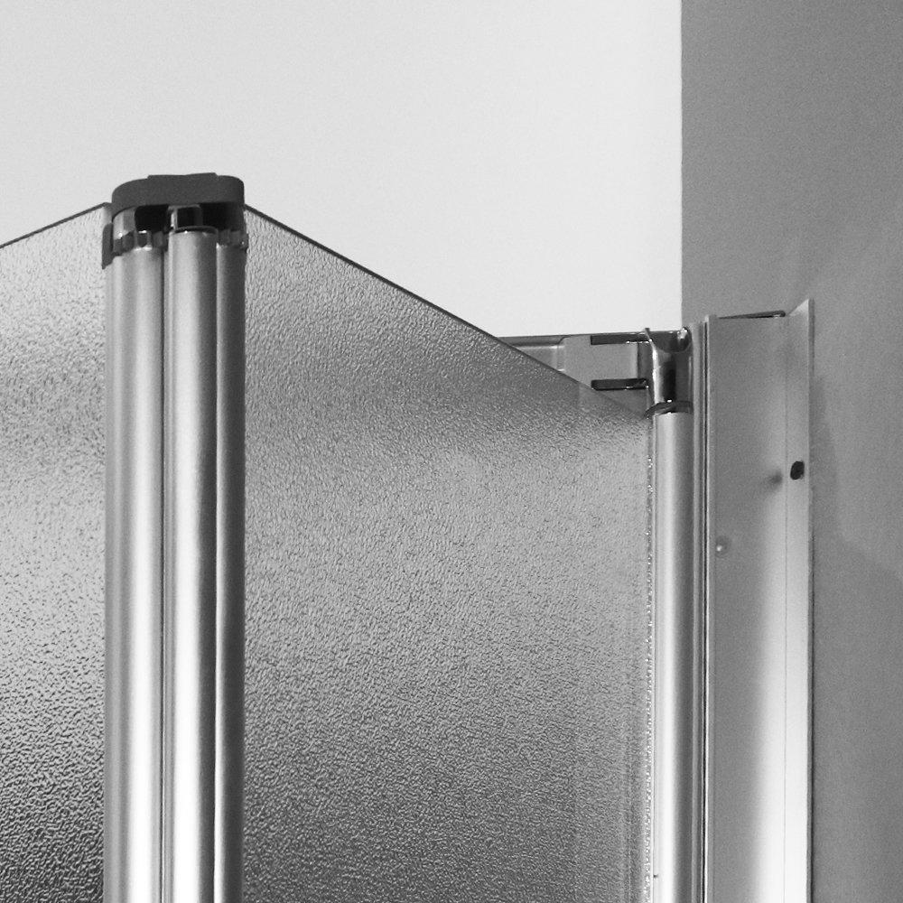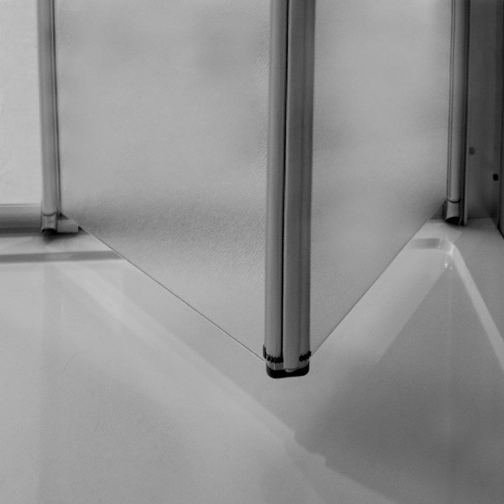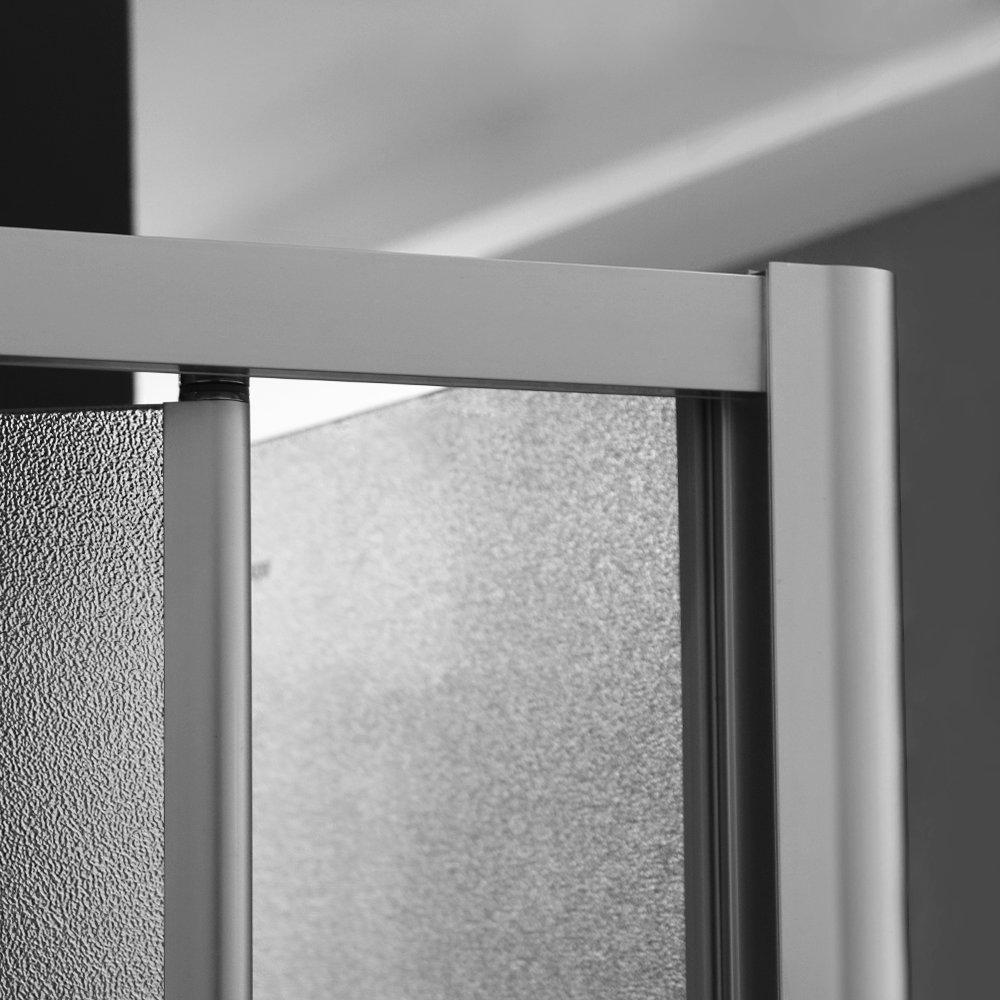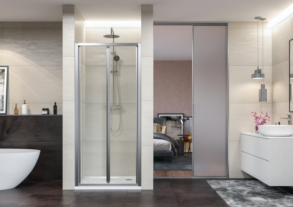 Sprchové dveře skládací. Kvalitní celorámové provedení s použitím povrchové úpravy eloxovaného chromu -‘chróm satin‘ je výrazná estetická odlišnost oproti klasickým provedením hliníkových rámů.