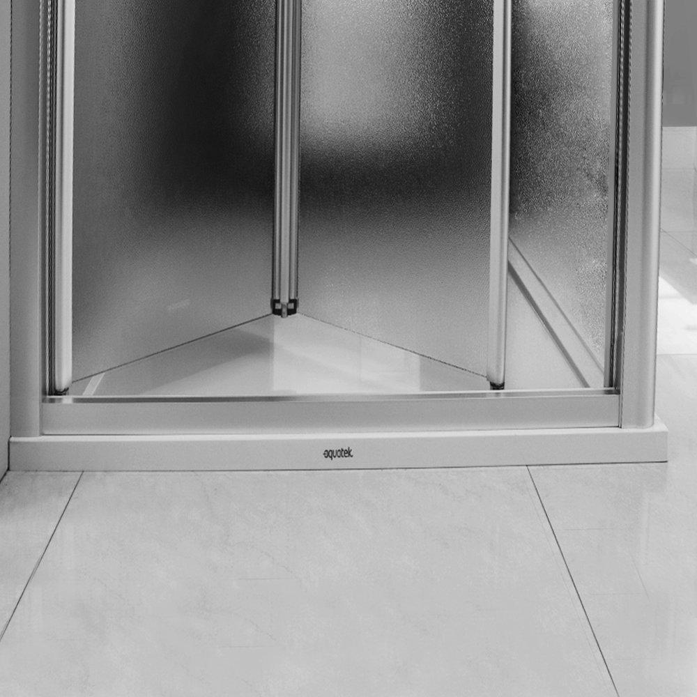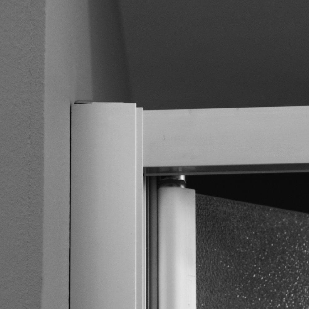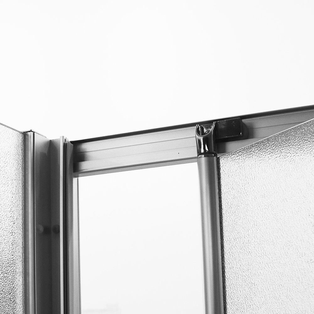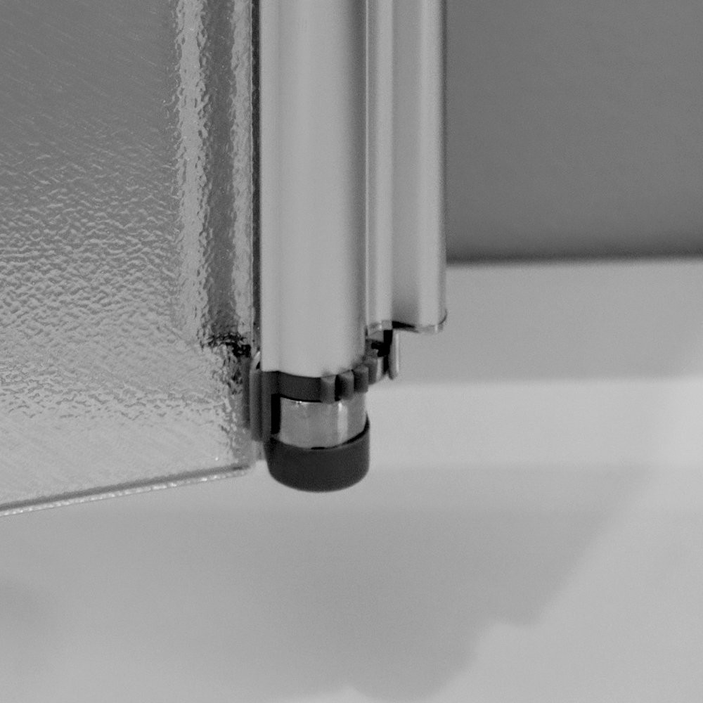 Sprchové dveře skládací. Kvalitní celorámové provedení s použitím povrchové úpravy eloxovaného chromu -‘chróm satin‘ je výrazná estetická odlišnost oproti klasickým provedením hliníkových rámů.