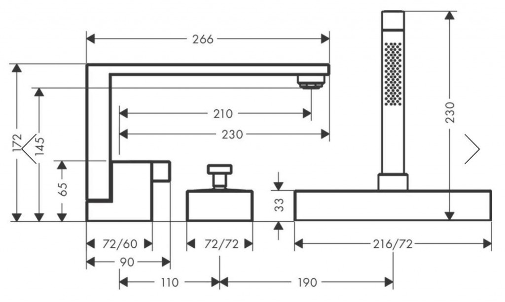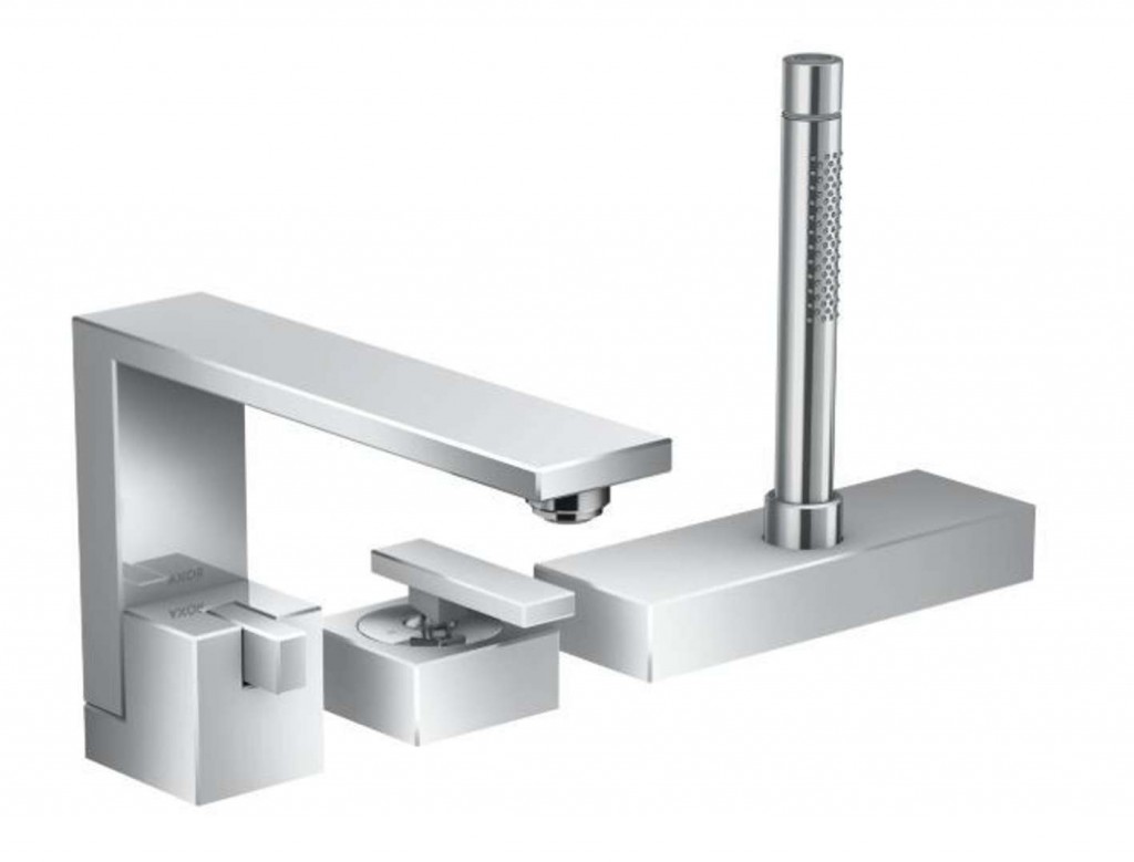 - obsahuje 3-otvorovou pákovou armaturu na okraj vany, tyčovou ruční sprchu, sprchový držák