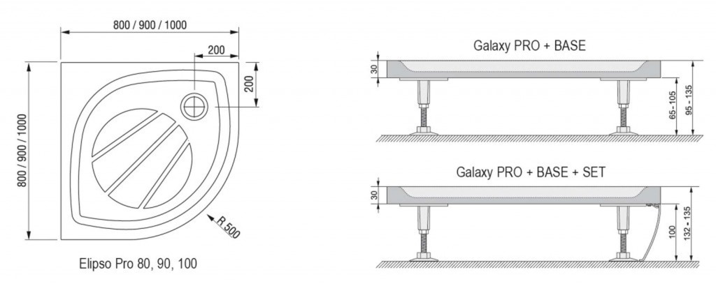 Čtvrtkruhová extra plochá sprchová vanička Elipso Pro-80