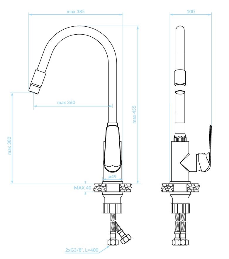 Flexibilní výtok s dosahem 360 mm umožňuje snadné ovládání proudu vody přesně tam, kde je potřeba – ideální pro velké nebo atypicky tvarované nádobí. Ergonomický design zaručuje pohodlné každodenní používání bez zbytečného námahy.