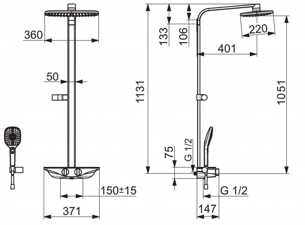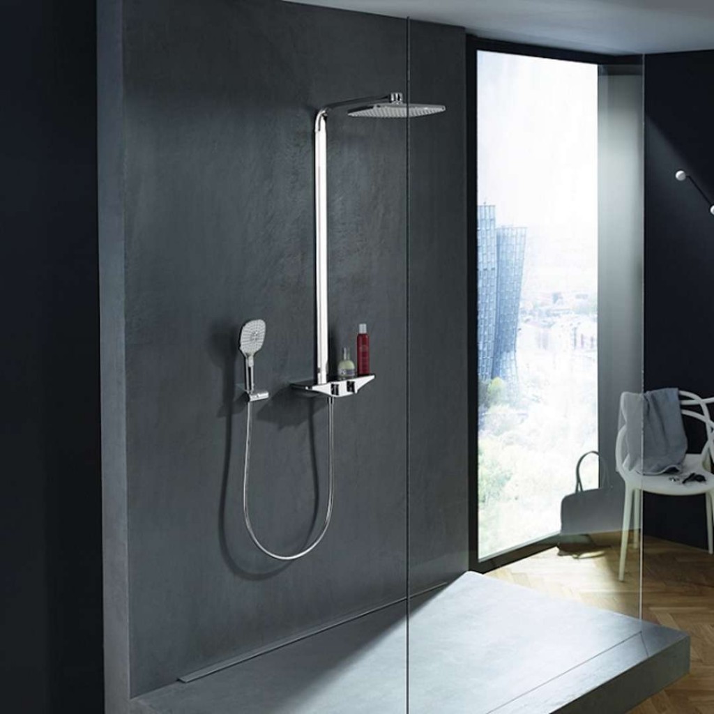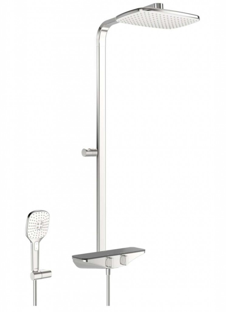 Nástěnný sprchový set obsahuje, hlavovou sprchu, ruční sprchu s hadicí, sprchovou tyč a držák