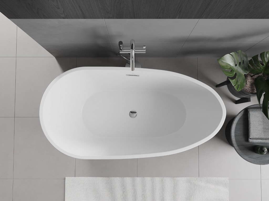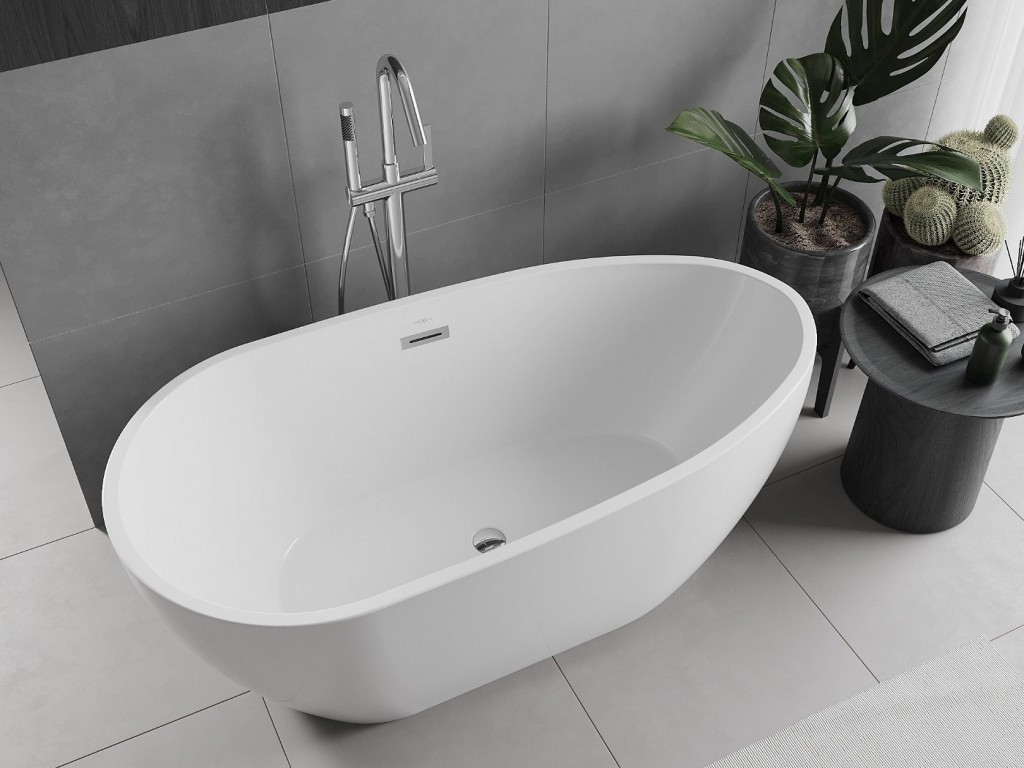 Volně stojící oválná akrylátová vana série EOS od výrobce MEXEN s přepadem a umístěném odpadu na středu vany.