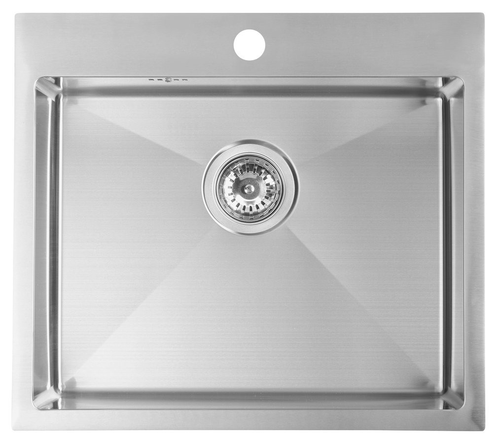 Dřez je usazen shora, s pracovní deskou tvoří rovinu, je do ní integrován. |