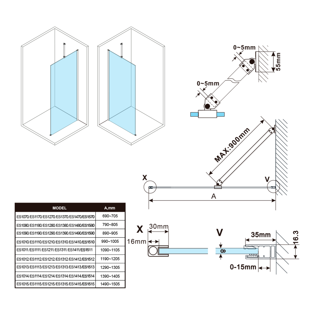 - Stěnové profily s tolerancí 15 mm usnadňují stabilní montáž zástěn, instalace je možná na dlažbu nebo sprchovou vaničku