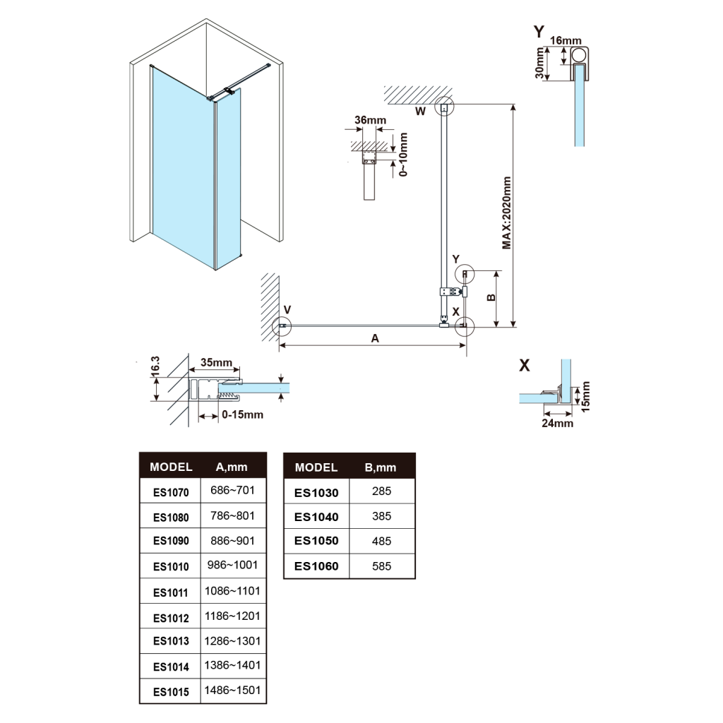 - Stěnové profily s tolerancí 15 mm usnadňují stabilní montáž zástěn, instalace je možná na dlažbu nebo sprchovou vaničku