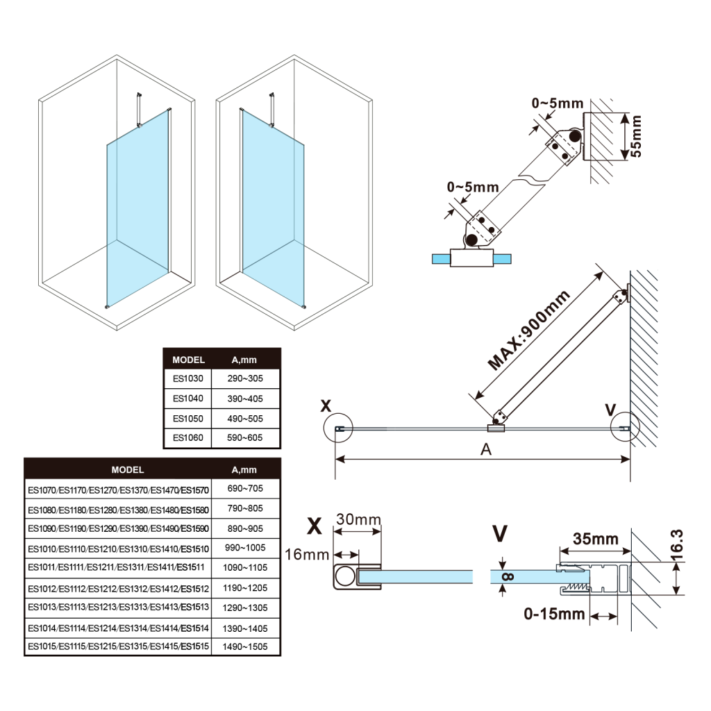 - Stěnové profily s tolerancí 15 mm usnadňují stabilní montáž zástěn, instalace je možná na dlažbu nebo sprchovou vaničku