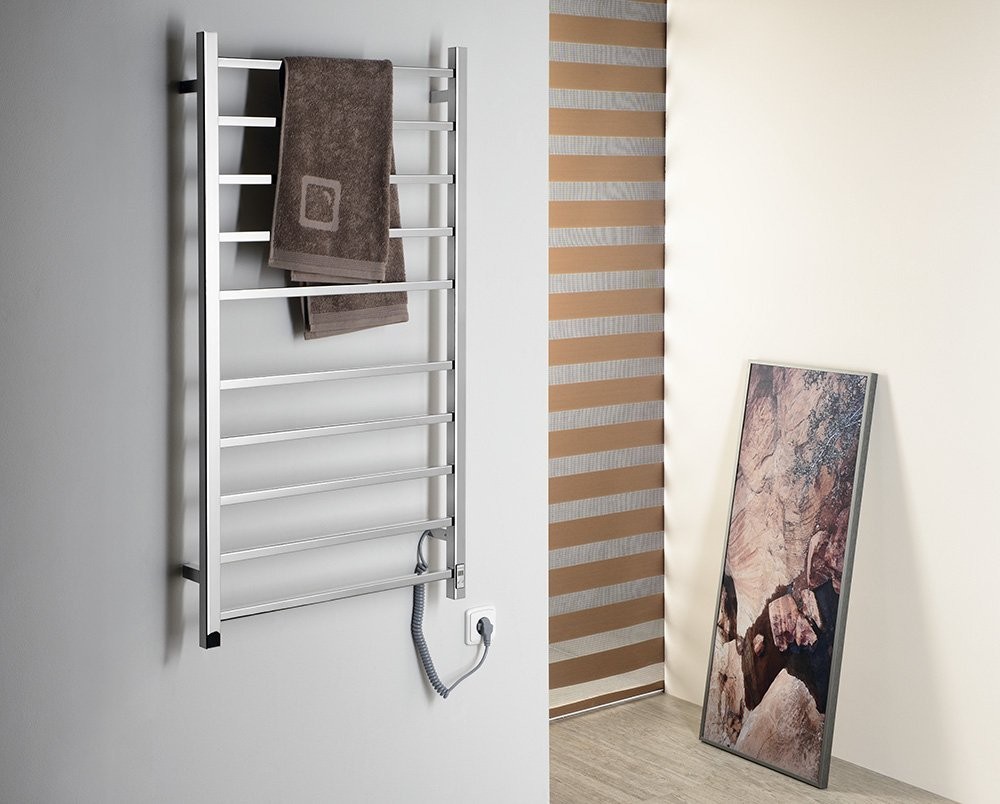Elektrické otopné těleso ESKINADO je vyrobeno z nerezové oceli. Design hranatých profilů poskytne koupelně ojedinělý vzhled. Uvnitř topného tělesa je umístěn odporový drát bez použití kapalné plnící směsi. Otopné těleso má koncovku do elektrické zásuvky a ve spodní části vertikálního profilu je integrován vypínač s časovačem. Je určeno k nahřívání a sušení ručníků, které oceníte především v zimním období.
