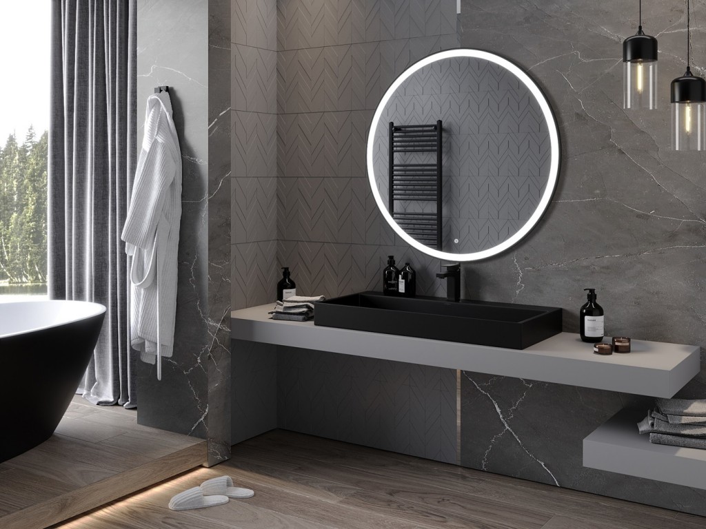 Moderní a jednoduché kulaté zrcadlo kolekce ESSO je vybaveno LED podsvícením, které se snadno ovládá pomocí dotykového tlačítka přímo na ploše zrcadla. Zrcadlo je vybaveno vyhřívací podložkou ANTI-CAR, která eliminuje zamlžení skla.