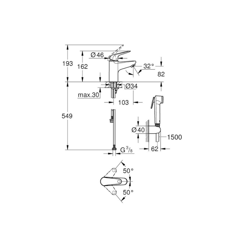 Páková umyvadlová baterie s bidetovou sprchou DN15, velikost S