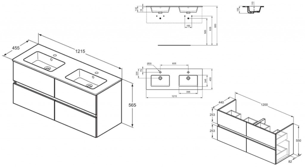 - rozměr dvojumyvadla: 155 x 1215 x 455 mm (VxŠxH)