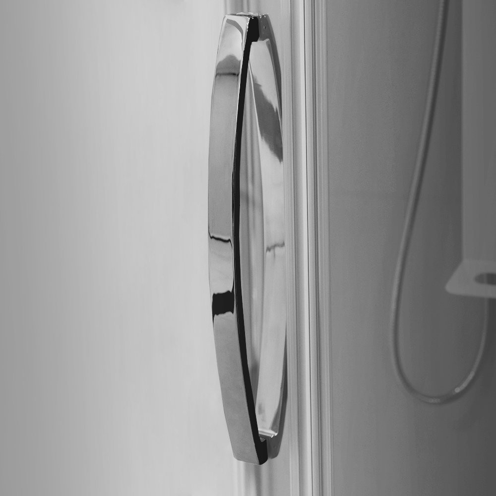 Sprchový kout obloukový s jedněmi otevíracími dveřmi na panty. Obloukové panty plasticky vyčnívají z linie skel a elegantně harmonizují s nepřehlédnutelným oválným úchytem.