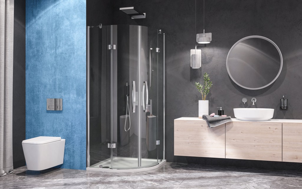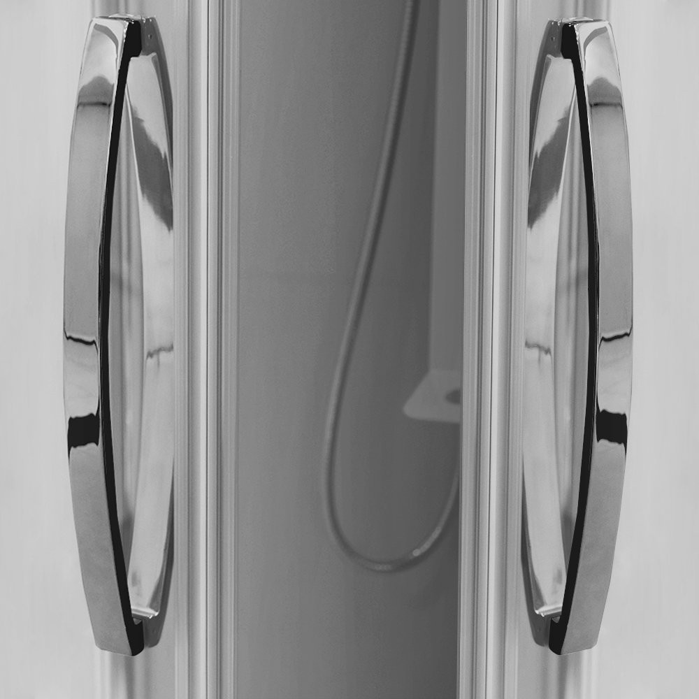 Sprchový kout obloukový s dvoumi otvíracími dveřmi na panty. Obloukové panty plasticky vyčnívají z linie skel a elegantně harmonizují s nepřehlédnutelným oválným úchytem.