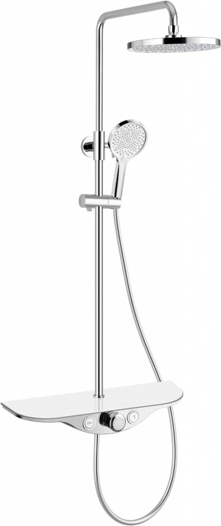 Sprchový sloup je vyroben z nerezové oceli a ABS. Sloup je uchycený ke stěně pomocí stěnového držáku. Hlavová sprcha je z plastu kulatého tvaru, průměru 22,5 cm a je umístěna pomocí kulového kloubu na horním rameni. Kloub umožňuje nastavení směru proudění vody podle vašich potřeb. Na tyči je umístěný posuvný držák s plastovou, 3 funkční ruční sprchou, která je propojená pomocí PVC hadice dlouhé 150 cm.