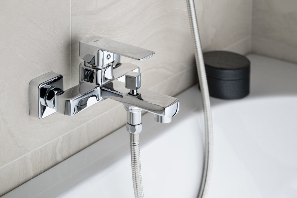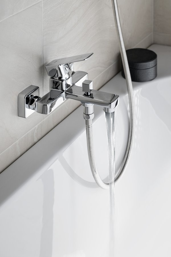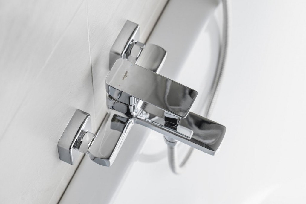 Série pákových baterií FACTOR je charakteristická kombinací hranatých tvarů a zaoblených rohů.