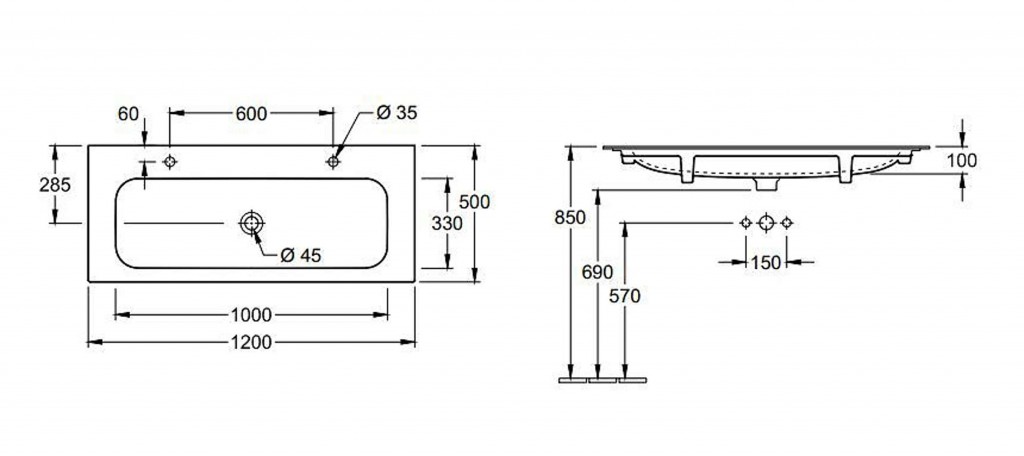 Nábytkové dvojumyvadlo bez přepadu s CeramicPlus, 2 otvory