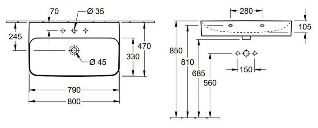 Umyvadlo obdélníkového tvaru se skrytým přepadem