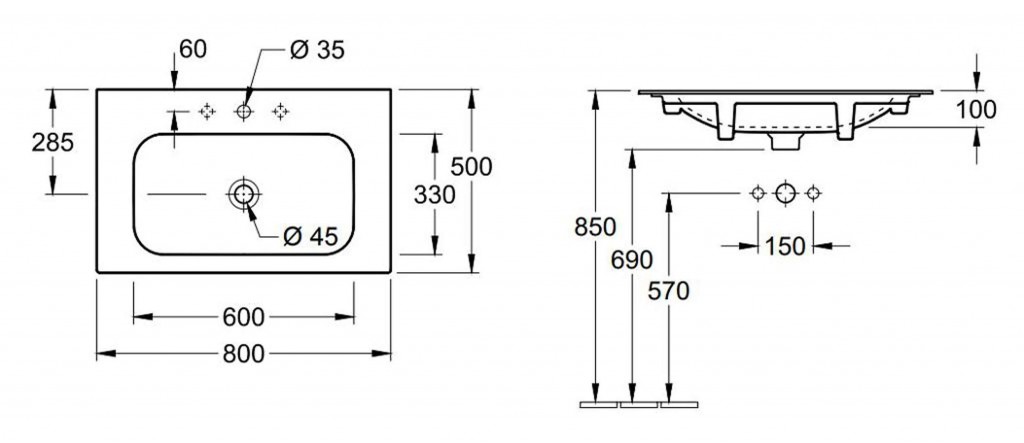 Nábytkové umyvadlo obdélníkového tvaru na desku s CeramicPlus