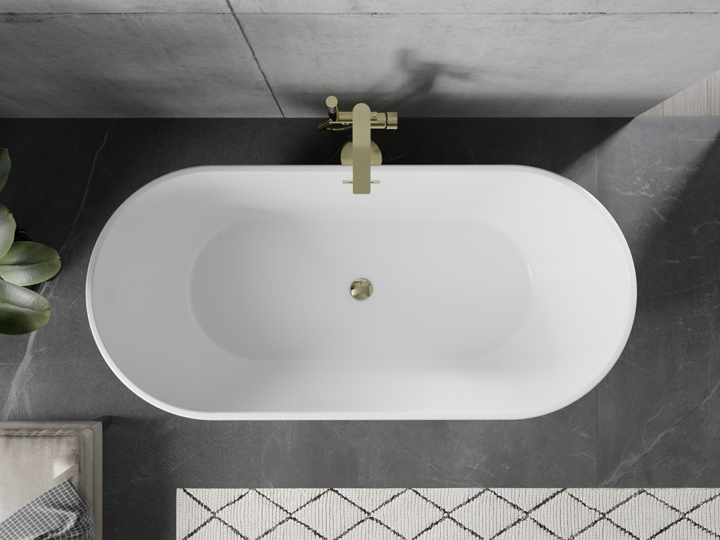 Volně stojící oválná akrylátová vana série FLAVIA od výrobce MEXEN s přepadem a umístěném odpadu na středu vany.