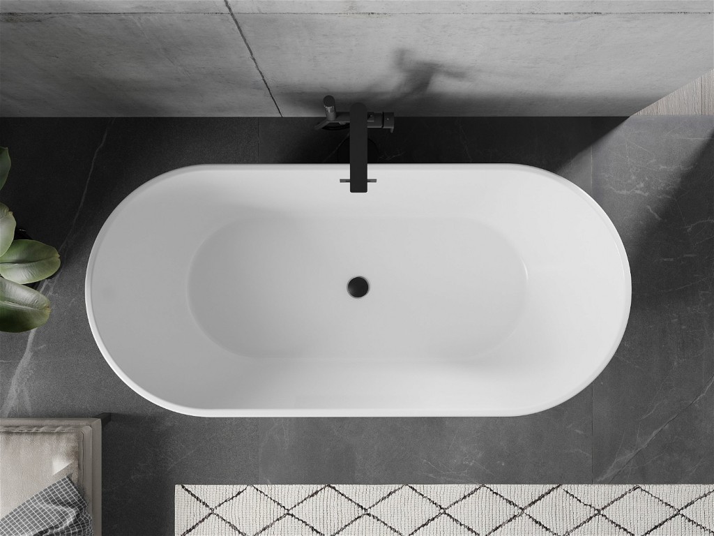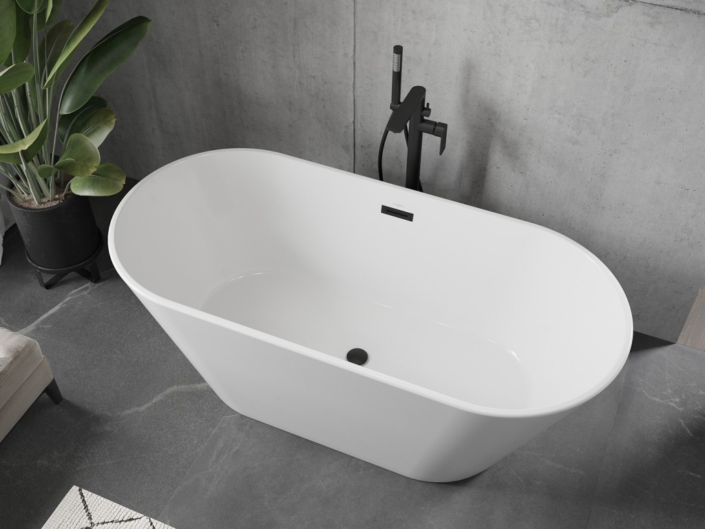 Volně stojící oválná akrylátová vana série FLAVIA od výrobce MEXEN s přepadem a umístěném odpadu na středu vany.