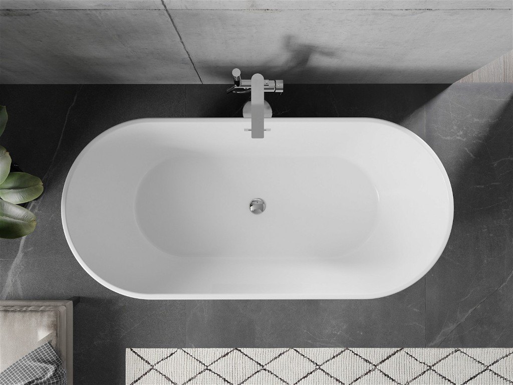 Volně stojící oválná akrylátová vana série FLAVIA od výrobce MEXEN s přepadem a umístěném odpadu na středu vany.