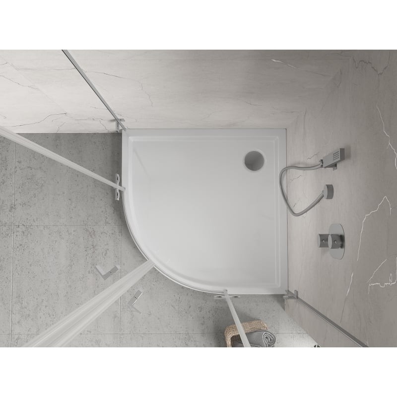 Specifikace produktu: Rozměr: 80x80x12 cm Poloměr zaoblení R55 Barva: Lesklá bílá Typ: Půlkruhový Materiál: Sanitární akrylát Zesílené dno Průměr odtoku: 90 mm Sprchová vanička neobsahuje sifon