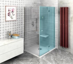 Bezrámové pantové zástěny FORTIS v moderním hranatém designu. Minimalistické pochromované panty v nekompromisním hranatém designu, zevnitř zapuštěné pro snadné čištění a se zvedací funkcí pro pohodlné otevírání. Bezpečnostní čiré sklo v tloušťce 8 mm je ošetřené povrchovou úpravou ANTIDROP pro snadné čištění. Výška 2000 mm. Hranaté pochromované madlo ve stejném minimalistickém designu jako panty.