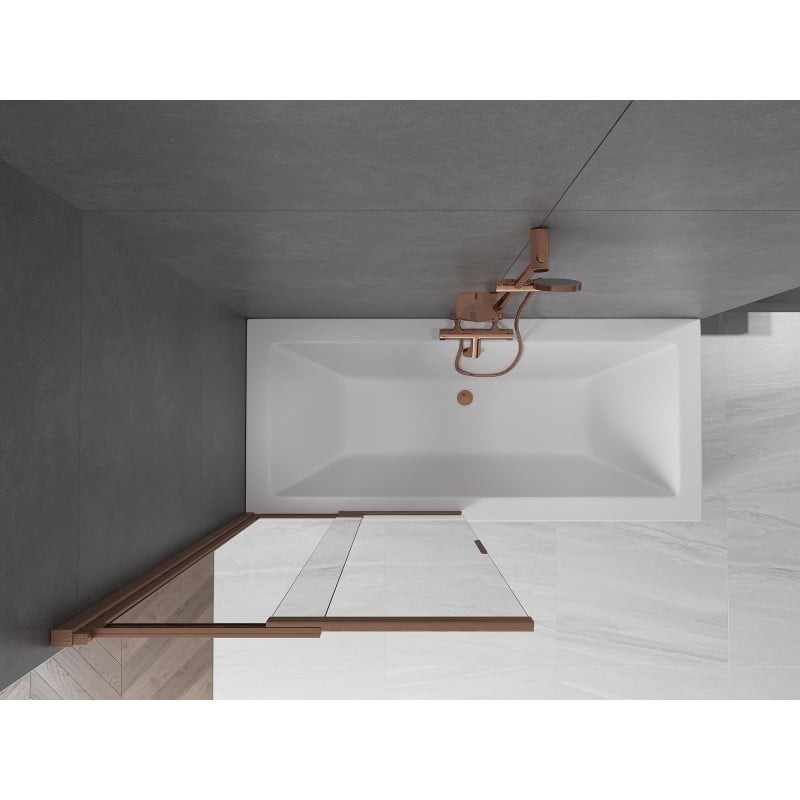 Technické údaje: Šířka: 85 cm Výška: 150 cm Typ: Dvoukřídlé Montáž: Univerzální Typ: Posuvné/Posuvné Typ skla: Tvrzené Barva skla: Průhledné Tloušťka skla: 5 mm Povrchová úprava: Kartáčovaná měď Povlak pro snadné čištění Vyrovnání nerovností stěn Sada těsnění pro odvod vody