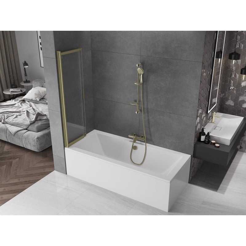 Technické údaje: Šířka: 85 cm Výška: 150 cm Typ: Dvoukřídlé Montáž: Univerzální Typ: Pohyblivé/Posuvné Typ skla: Tvrzené Barva skla: Průhledné Tloušťka skla: 5 mm Povrchová úprava: Kartáčované zlato Povlak pro snadné čištění Vyrovnání nerovností stěn Sada těsnění pro odvod vody