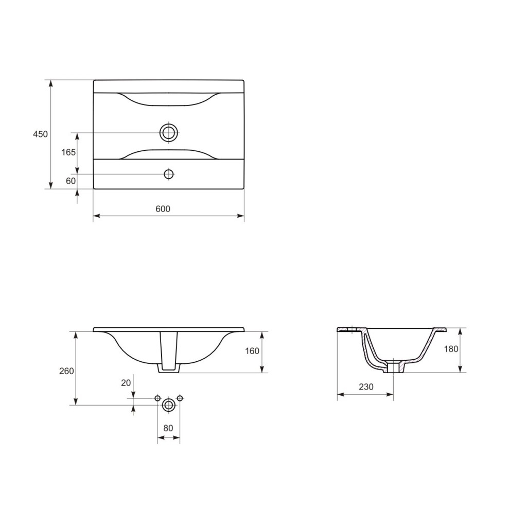 Nábytkové umyvadlo ONTARIO NEW 60 bílé barvy s otvorem pro baterii a s přepadem. Umyvadlo lze instalovat na desku nebo se skříňkami z řady COLOUR, MELAR, MESTA, SMART, STILLO.