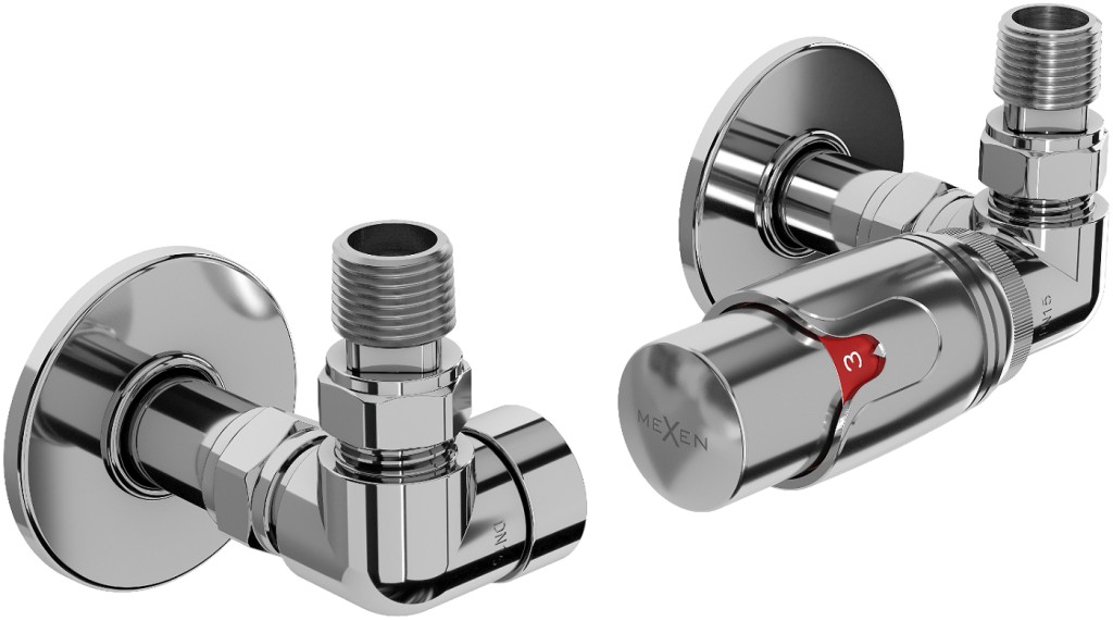 Termostatická sada ventilů (s nastavitelným ovládáním označeným "MEXEN" a číselným indikátorem) k radiátorům včetně kulatých rozetek. Výrobce MEXEN tuto termostatickou sadu nabízí v barevném provedení: chrom, bílá, zlato, antracit a černá.