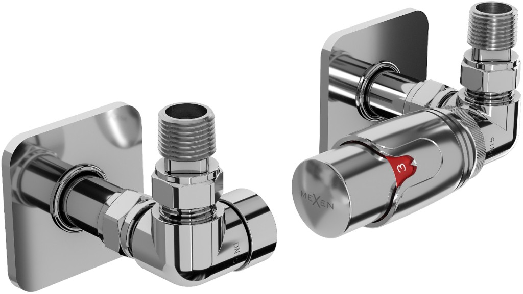 Termostatická sada ventilů (s nastavitelným ovládáním označeným "MEXEN" a číselným indikátorem) k radiátorům včetně hranatých rozetek. Výrobce MEXEN tuto termostatickou sadu nabízí v barevném provedení: chrom, bílá, zlato, antracit a černá.