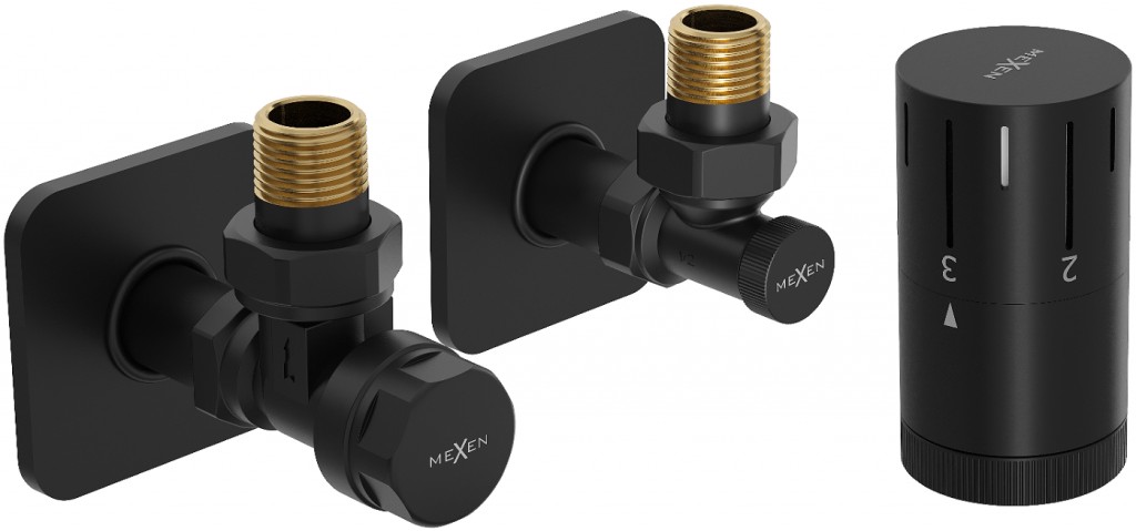 Termostatická sada ventilů (s nastavitelným ovládáním označeným "MEXEN" a číselným indikátorem) k radiátorům včetně hranatých rozetek. Výrobce MEXEN tuto termostatickou sadu nabízí v barevném provedení: chrom, bílá, zlato, antracit a černá.