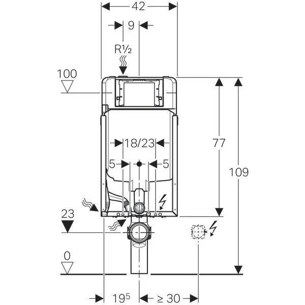 • Přívod vody R 1/2", vhodný pro MF, s integrovaným rohovým ventilem a ručním ovládacím kolečkem