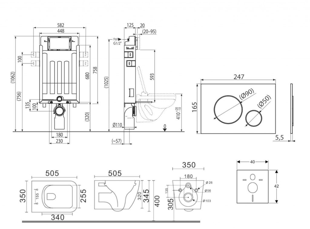 - Fixační set pro uchycení WC mísy: závitová tyč M12 – 2 ks, podložky – 4 ks, krytka – 2 ks, matice – 2 ks, chránička závitu – 2 ks