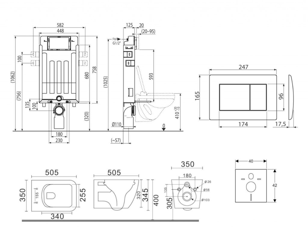 - Fixační set pro uchycení WC mísy: závitová tyč M12 – 2 ks, podložky – 4 ks, krytka – 2 ks, matice – 2 ks, chránička závitu – 2 ks