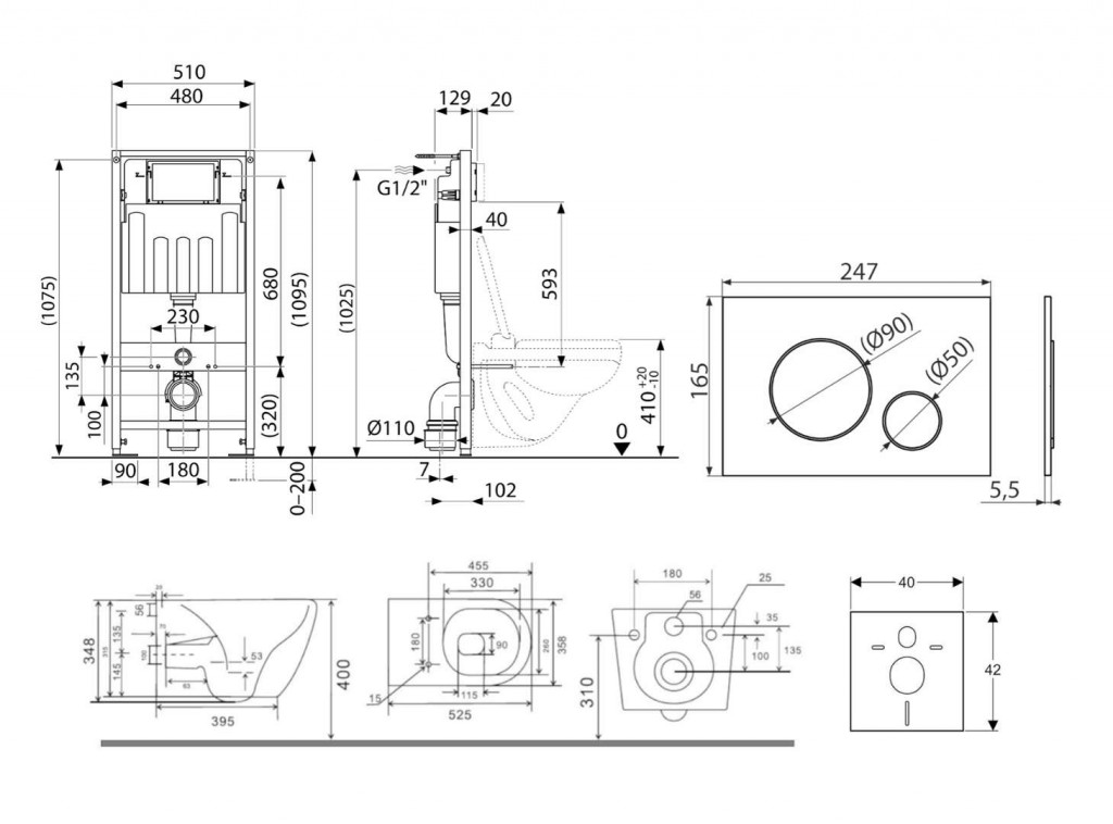 - Fixační set pro uchycení WC mísy: závitová tyč M12 – 2 ks, podložky – 4 ks, krytka – 2 ks, matice – 2 ks, chránička závitu – 2 ks