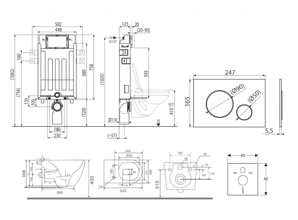- Fixační set pro uchycení WC mísy: závitová tyč M12 – 2 ks, podložky – 4 ks, krytka – 2 ks, matice – 2 ks, chránička závitu – 2 ks