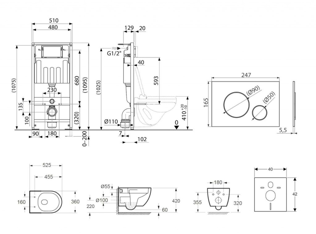 - Fixační set pro uchycení WC mísy: závitová tyč M12 – 2 ks, podložky – 4 ks, krytka – 2 ks, matice – 2 ks, chránička závitu – 2 ks