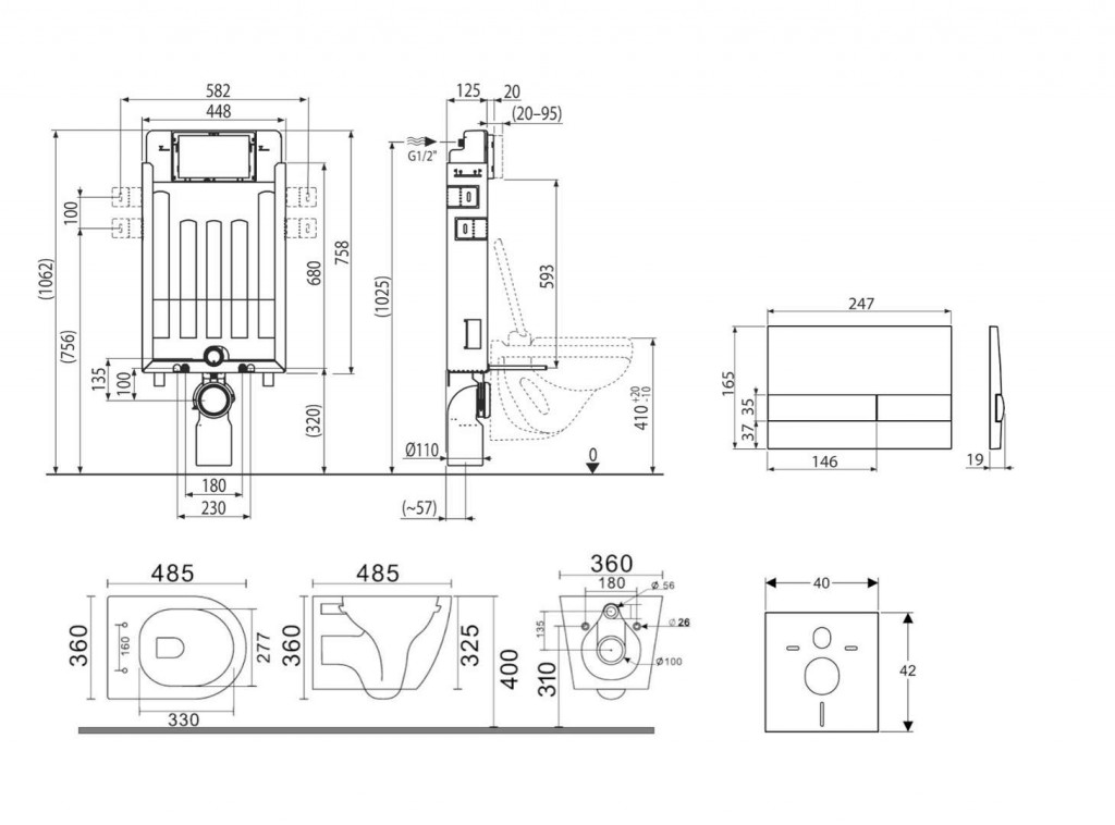- Fixační set pro uchycení WC mísy: závitová tyč M12 – 2 ks, podložky – 4 ks, krytka – 2 ks, matice – 2 ks, chránička závitu – 2 ks