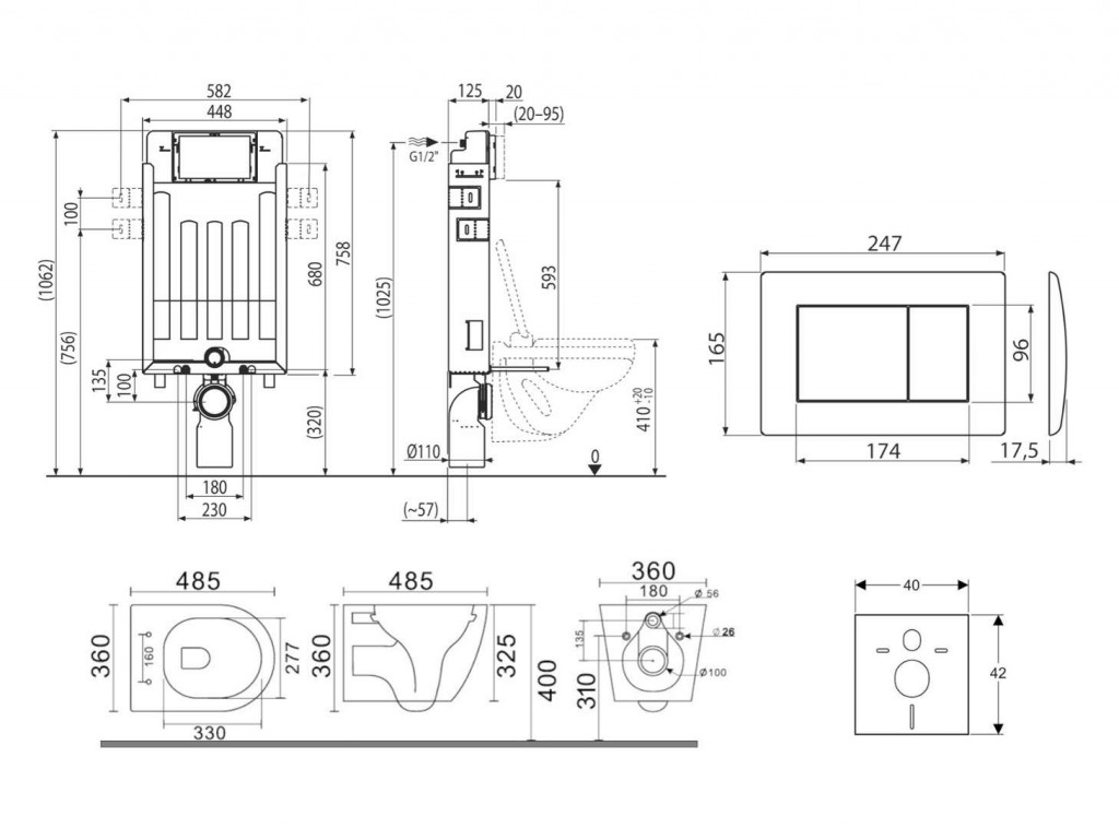 - Fixační set pro uchycení WC mísy: závitová tyč M12 – 2 ks, podložky – 4 ks, krytka – 2 ks, matice – 2 ks, chránička závitu – 2 ks