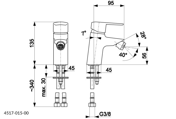 | Výbava | 5/4" ručně ovládaný odtok s přepadem, montážní sada s těsněním, flexibilní hadice M10x1/G3/8" (L=350 mm, 2 ks), klíč na perlátor |