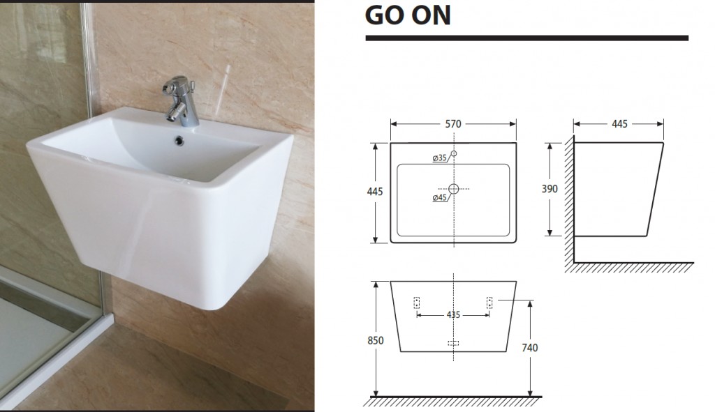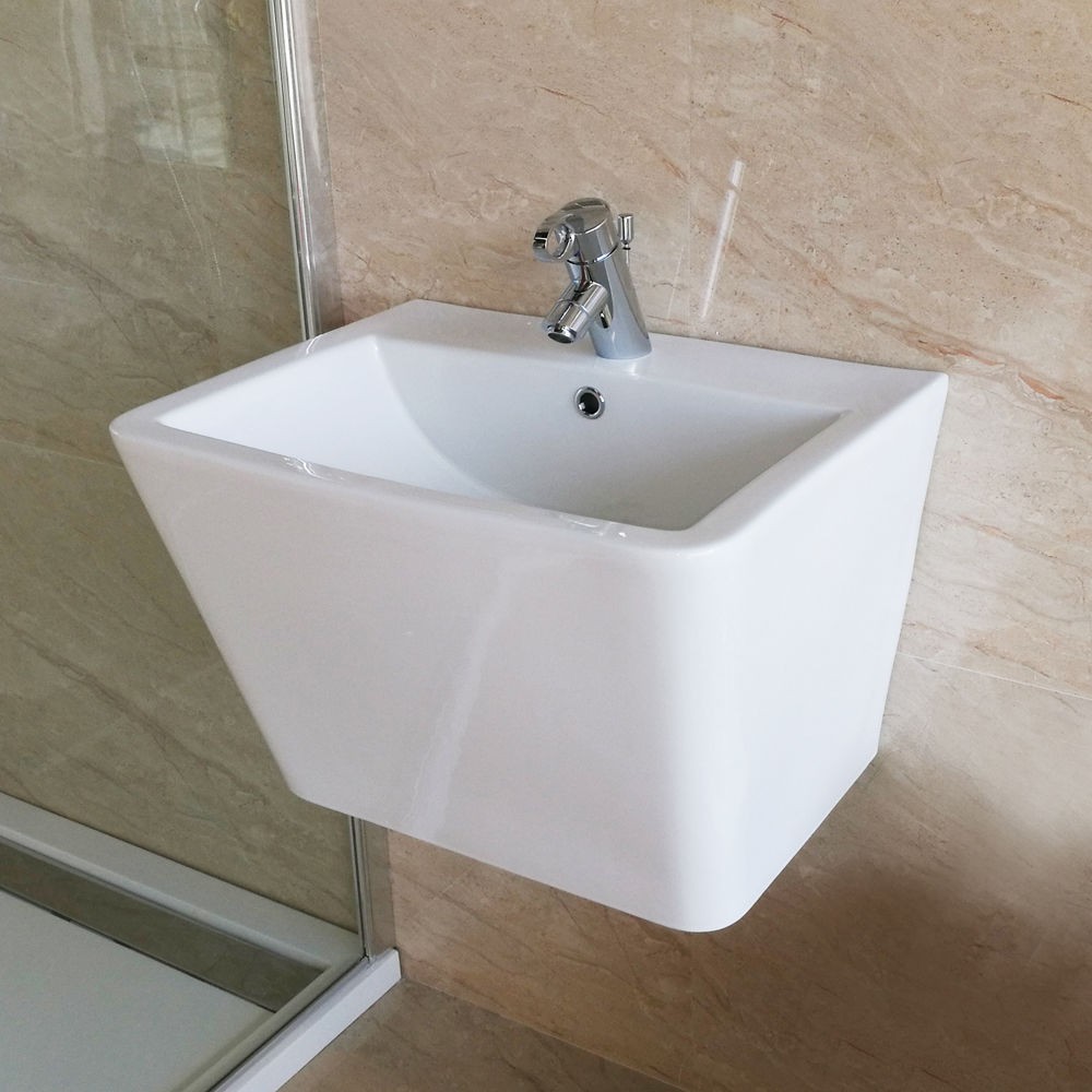 Závěsné keramické umyvadlo s otvorem pro baterii, včetně montážní sady.