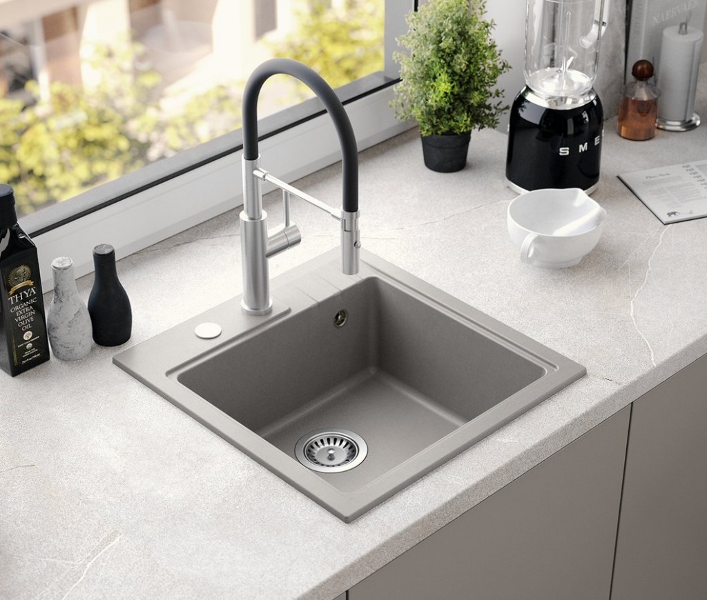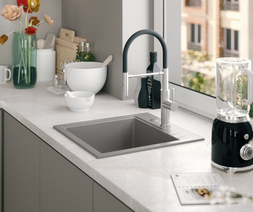 Dřez je usazen na pracovní desku a hranou ji převyšuje. |