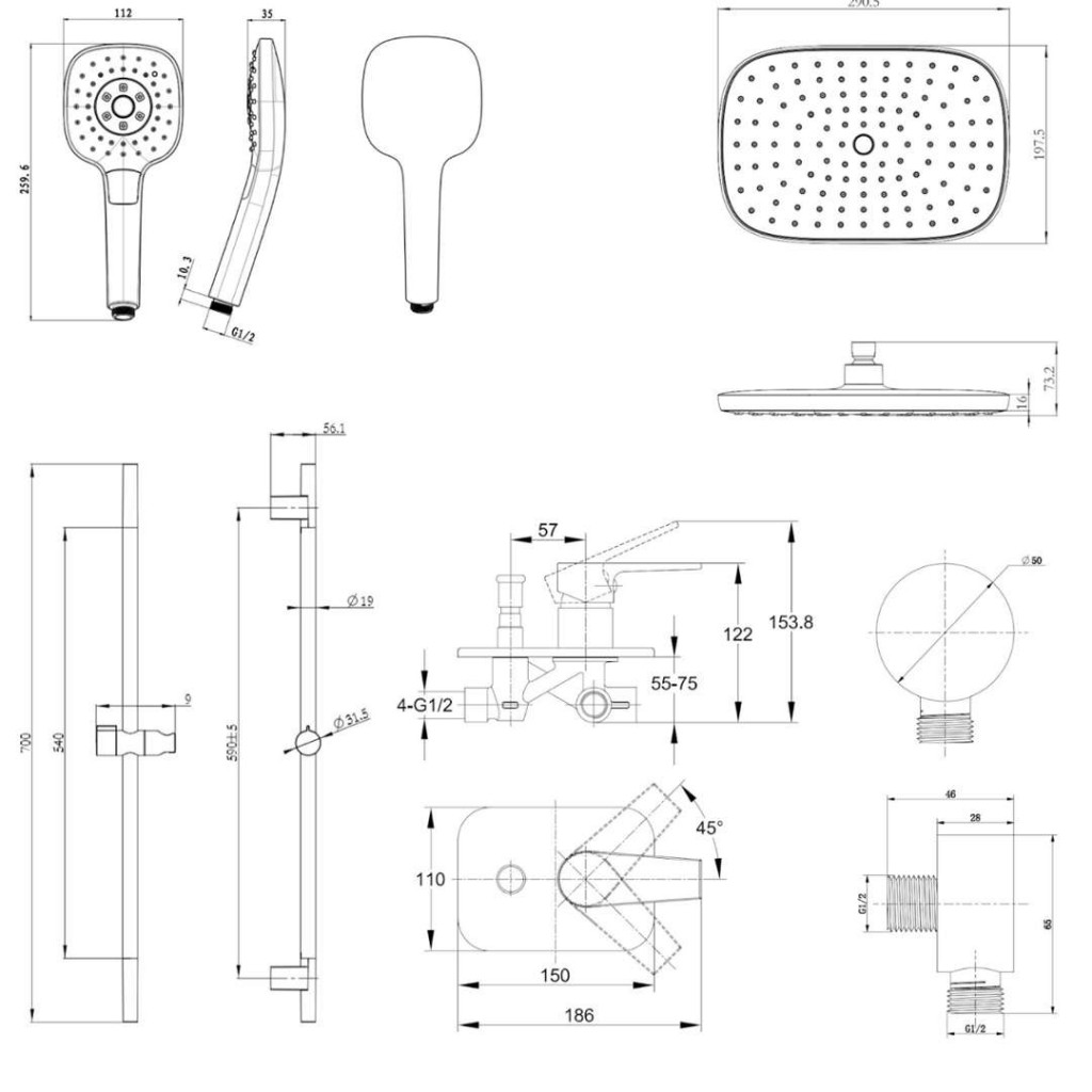 horní sprchu 290 x 198 mm se sprchovým ramenem 350 mm