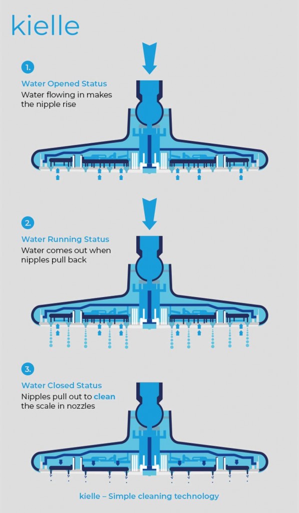 - kielle AutoClean - samočisticí jehly se vysunou skrz otvory při vypnutí tlaku vody, čímž dojde k vyčistění trysek