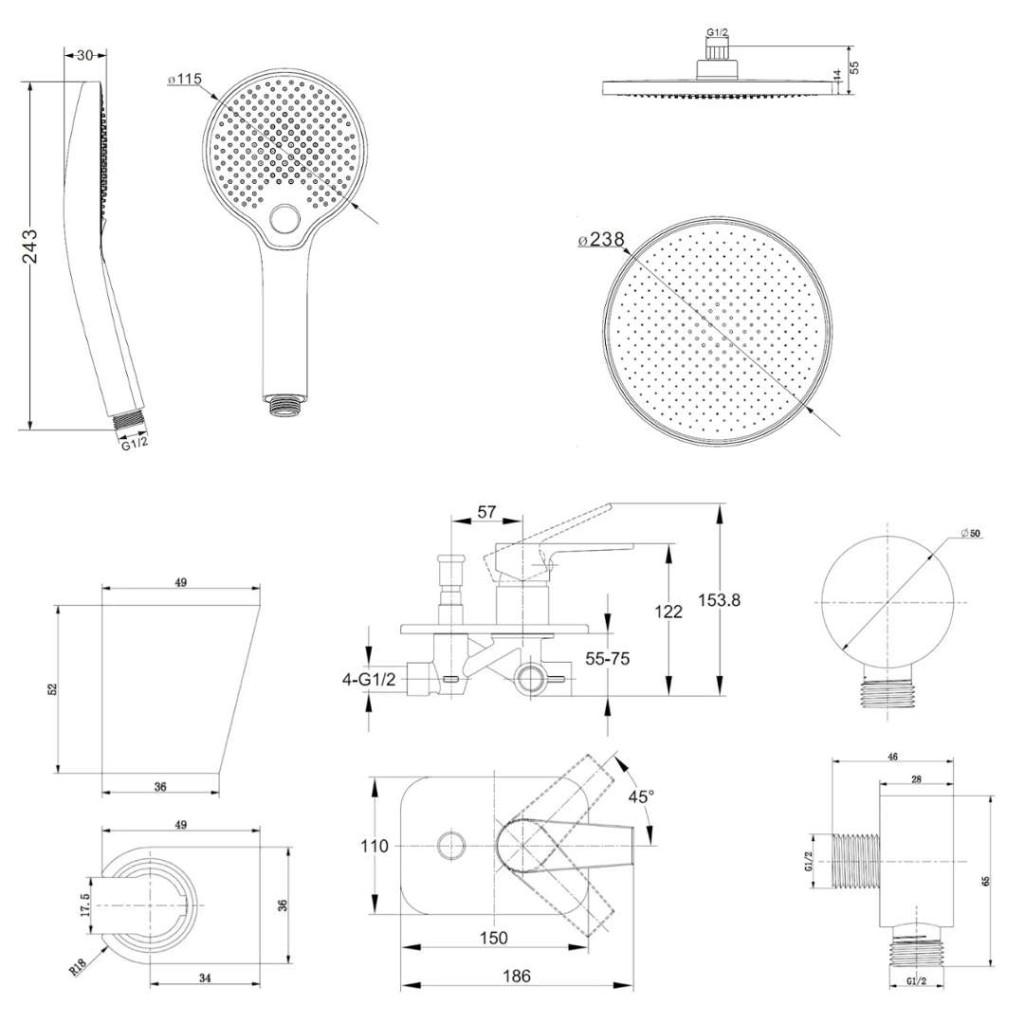 horní sprchu 238 mm se sprchovým ramenem 350 mm