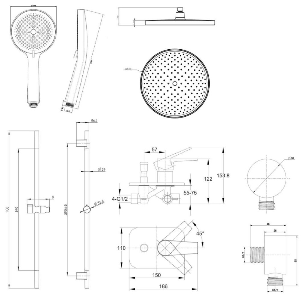 horní sprchu 300 mm se sprchovým ramenem 350 mm