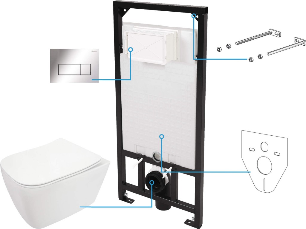 Toaletní set se závěsnou mísou byl navržen s ohledem na vysokou estetiku místnosti a snadné čištění. Odolná, kvalitní keramika nepraská a nemění barvu ani po delší době používání, což potvrdil výzkum Deante. Univerzální, klasická, bílá barva toaletního setu dodává místnosti eleganci. Vhodné pro zapuštěné instalace. Jedná se o kompletní sadu 6v1, která obsahuje: rám pro zapuštěnou montáž, toaletní mísu bez okraje, sedátko s tichým spouštěním, elegantní splachovací tlačítko, podložku tlumící nárazy a montážní šrouby.